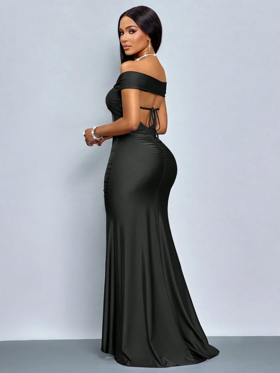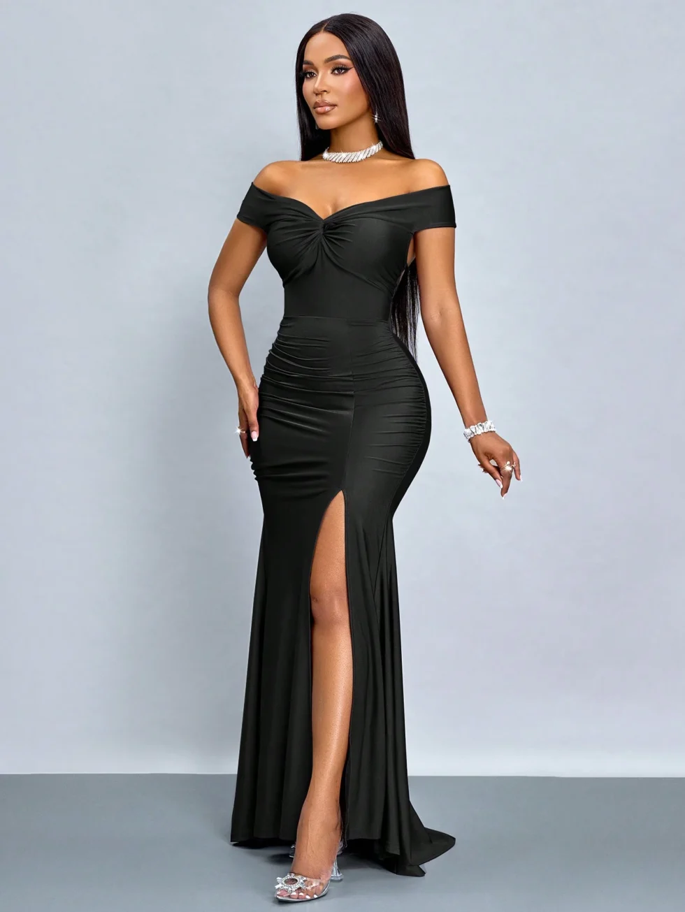 Vestido elegante de hombros descubiertos fruncido abertura en muslo
