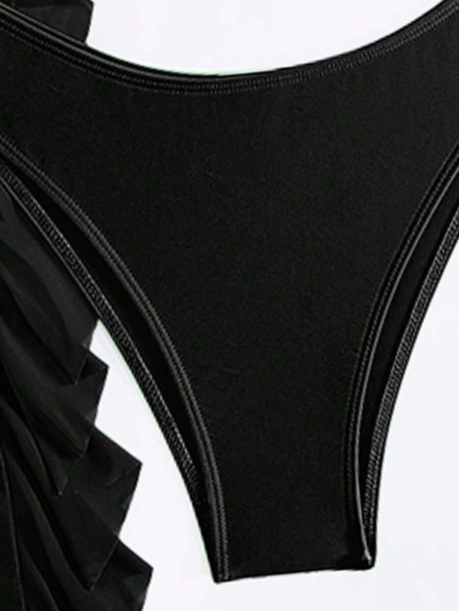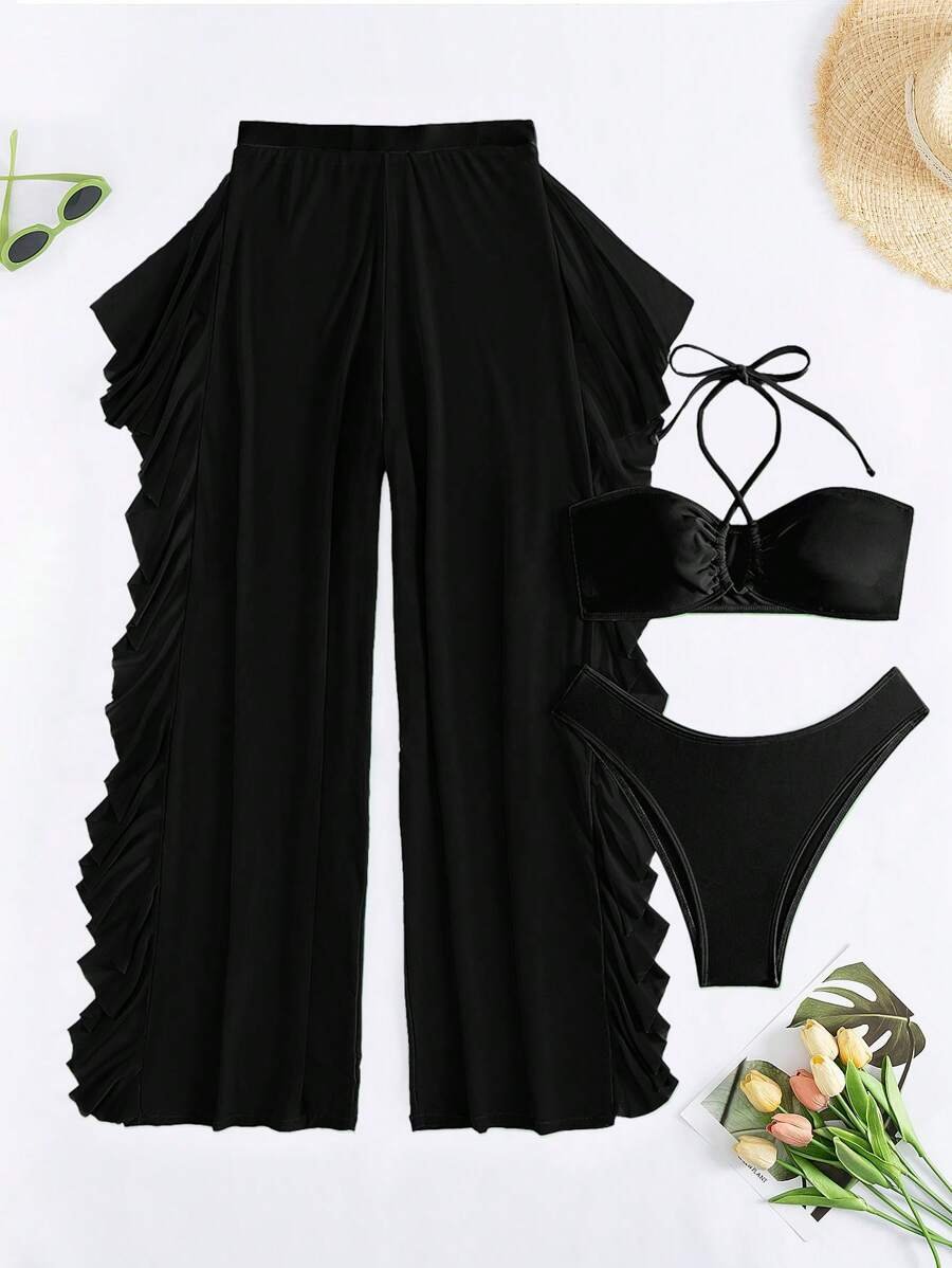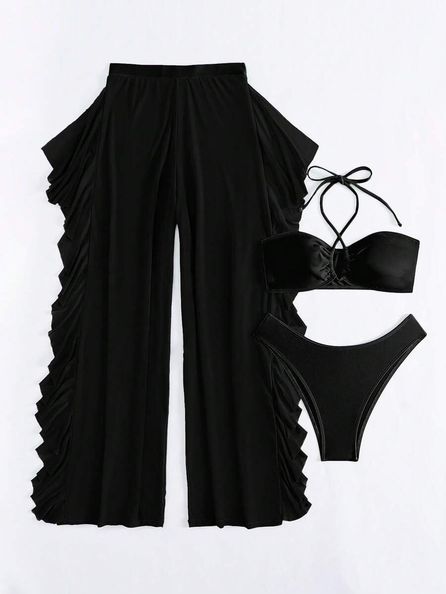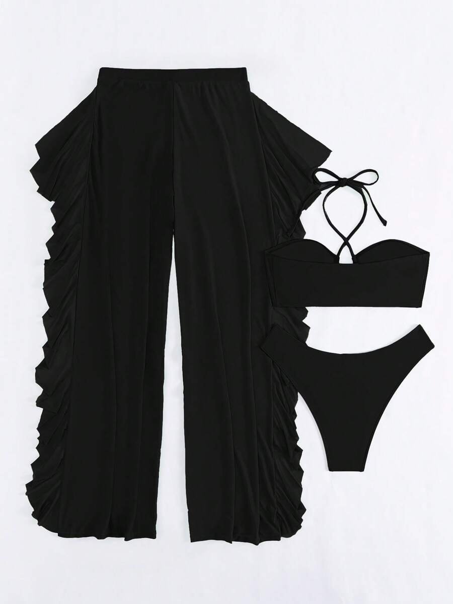 Traje de baño de 3 piezas top cruzado y pareo con vuelitos