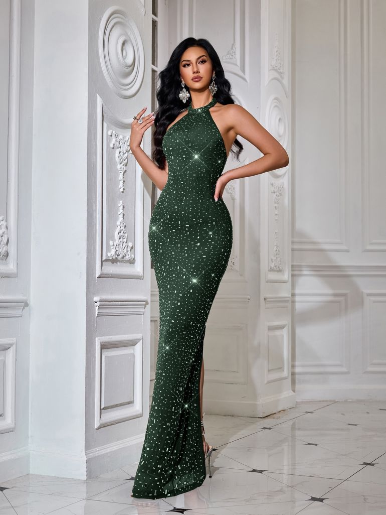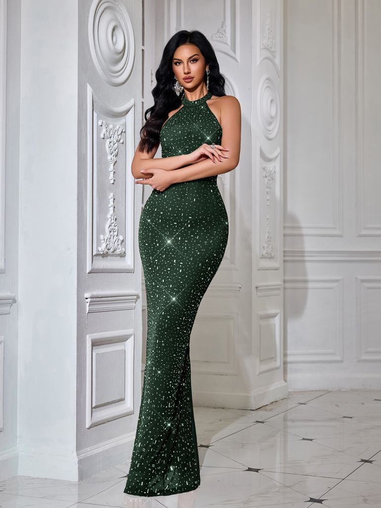 Vestido largo ajustado cuello alto espalda abierta