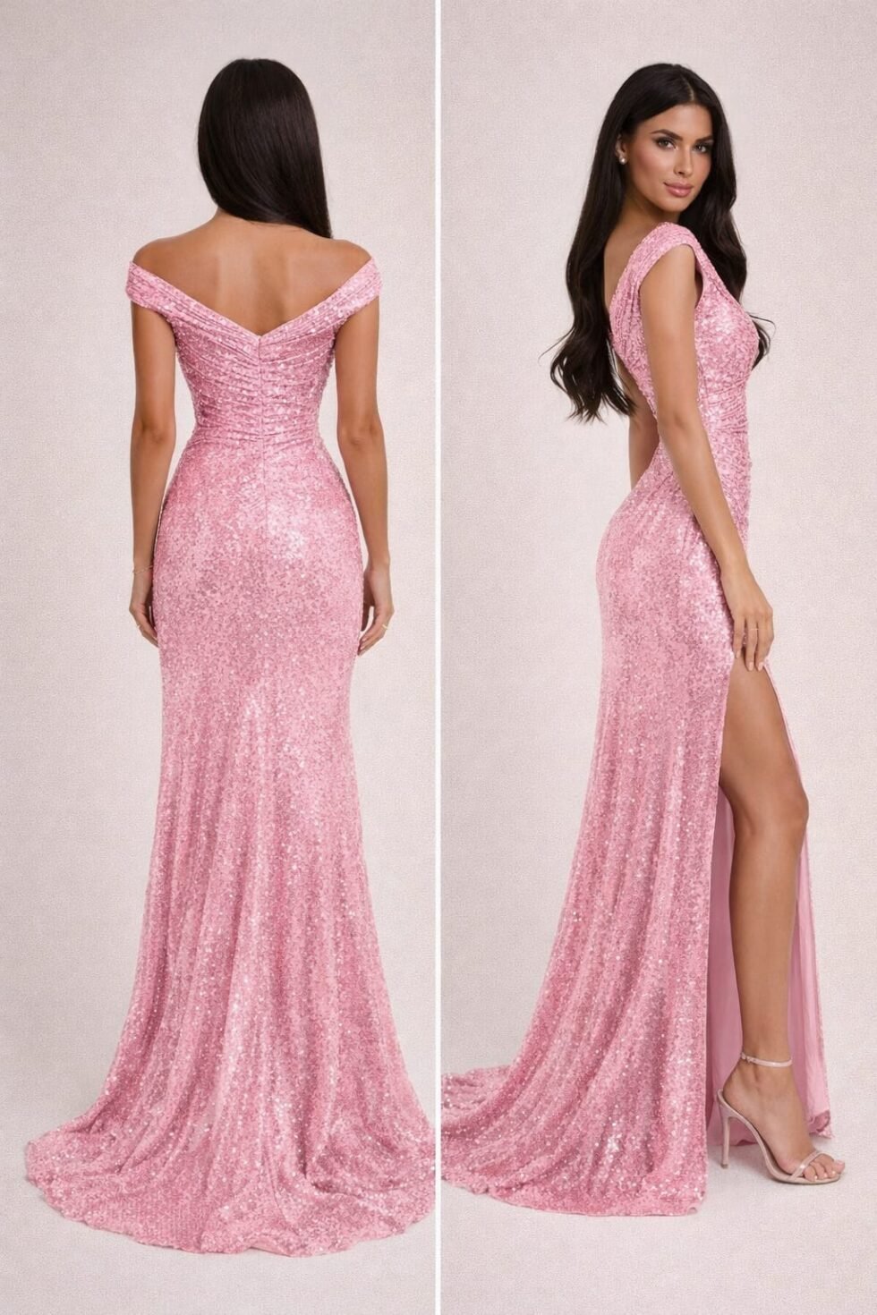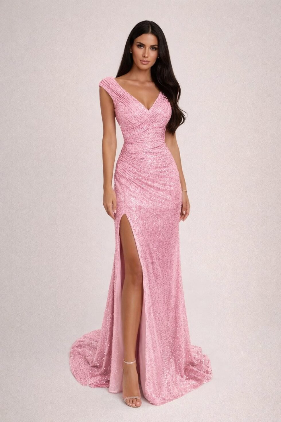 Vestido largo ajustado de lentejuelas abertura en muslo