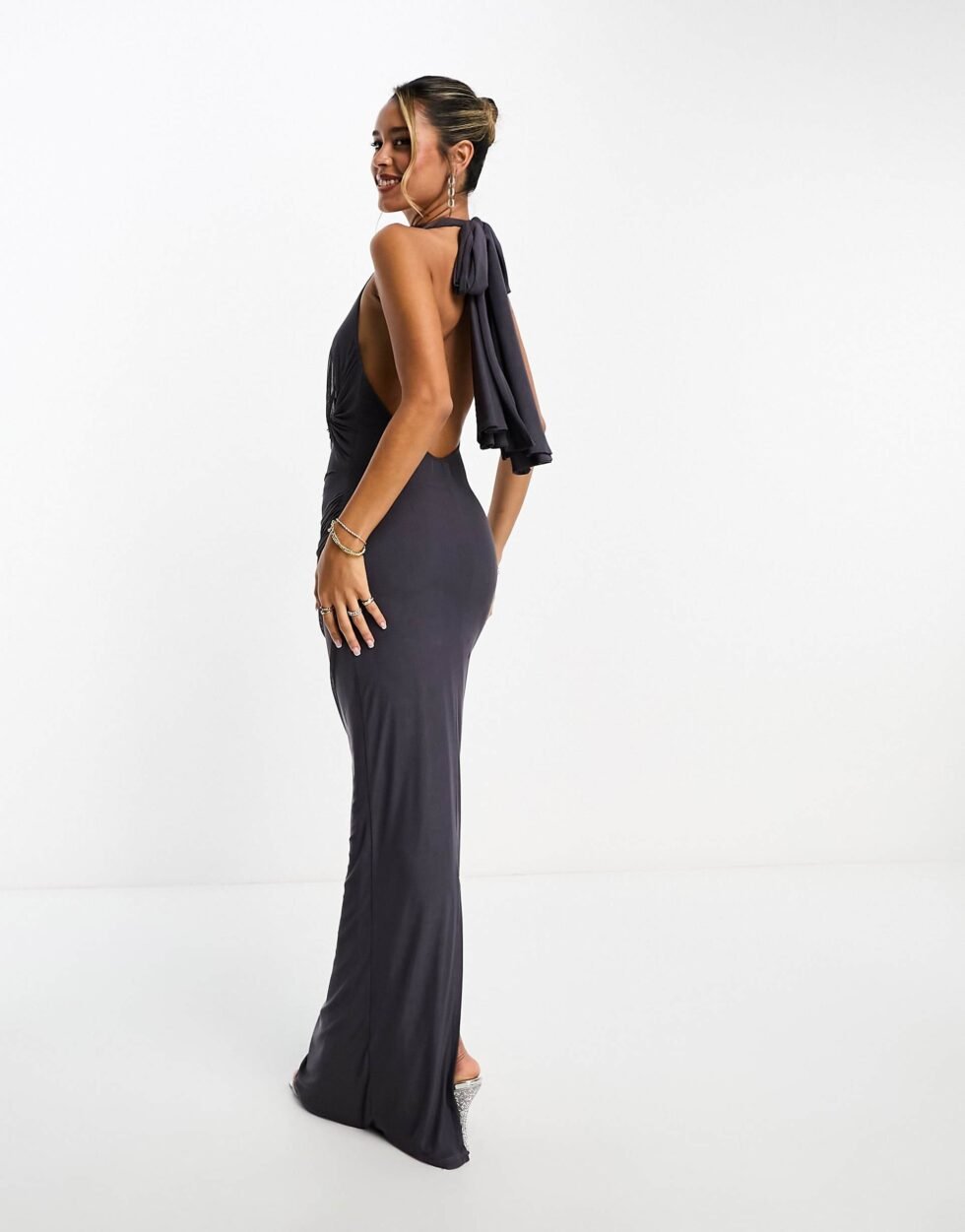 Vestido largo cuello alto espalda descubierta con lazo