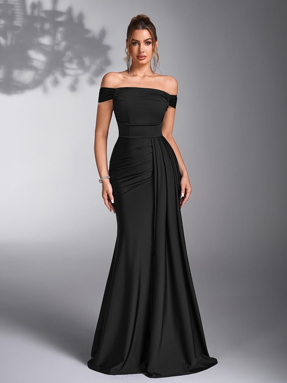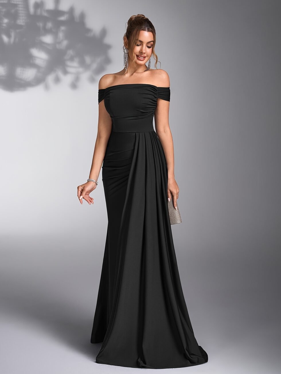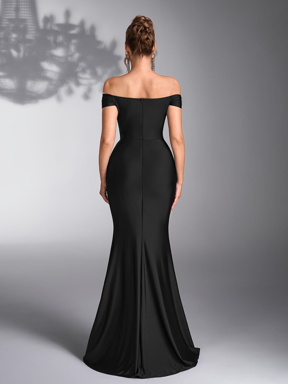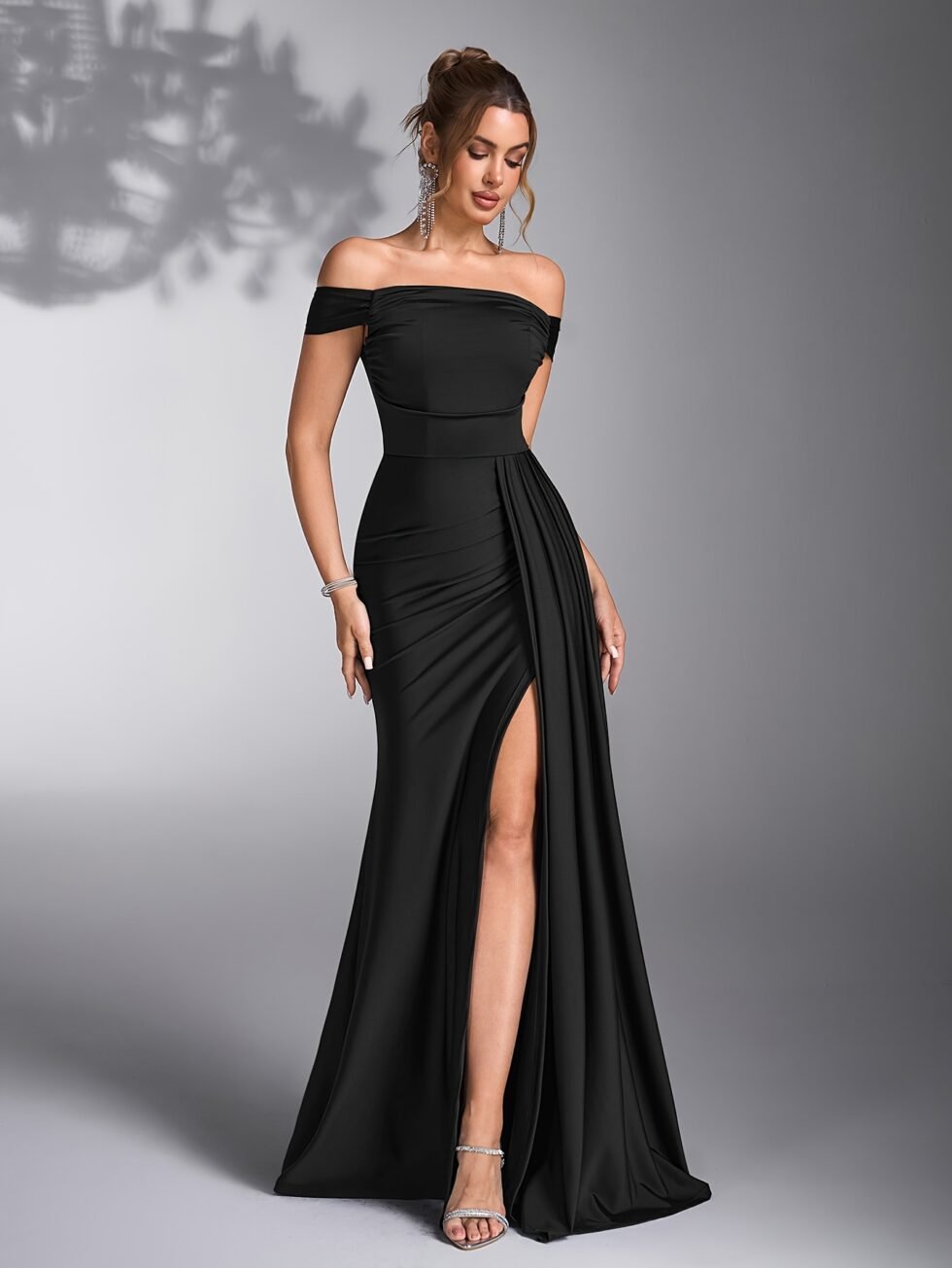 Vestido largo fruncido hombros descubiertos abertura alta lateral