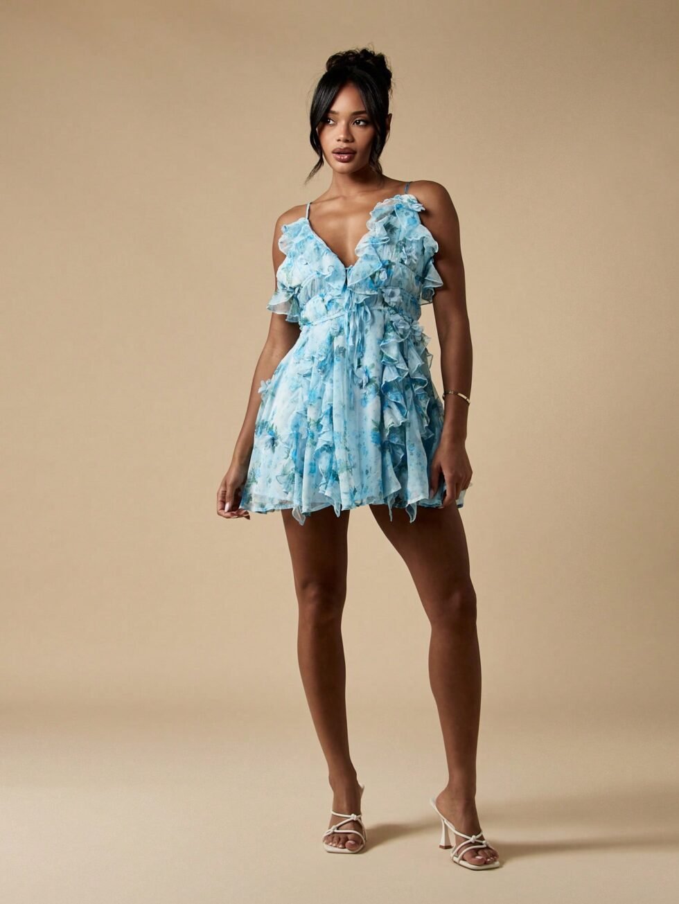 Vestido mini de gasa con cuello en V, estampado floral, ajustado y acampanado